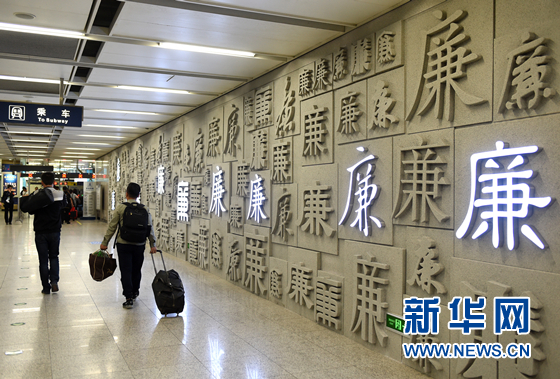 ▲5月9日,乘客从北京地铁六里桥站内的一面由一百多种不同字体的“廉”字组成的“廉字墙”旁走过。