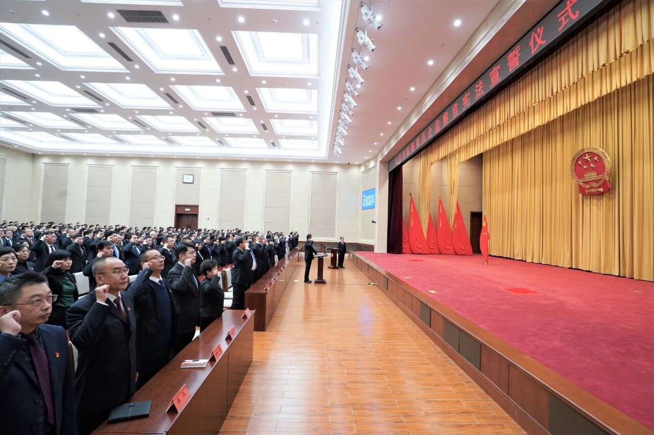 宣誓仪式开始,全体宣誓人面向国旗、国徽列队肃立,气氛庄严热烈。奏唱中华人民共和国国歌后,市纪委副书记、市监委副主任张铁军领诵誓词,其他宣誓人齐声跟诵。铿锵洪亮的誓词响彻全场,传递着维护宪法权威、捍卫宪法尊严、履行法定职责的坚定决心。