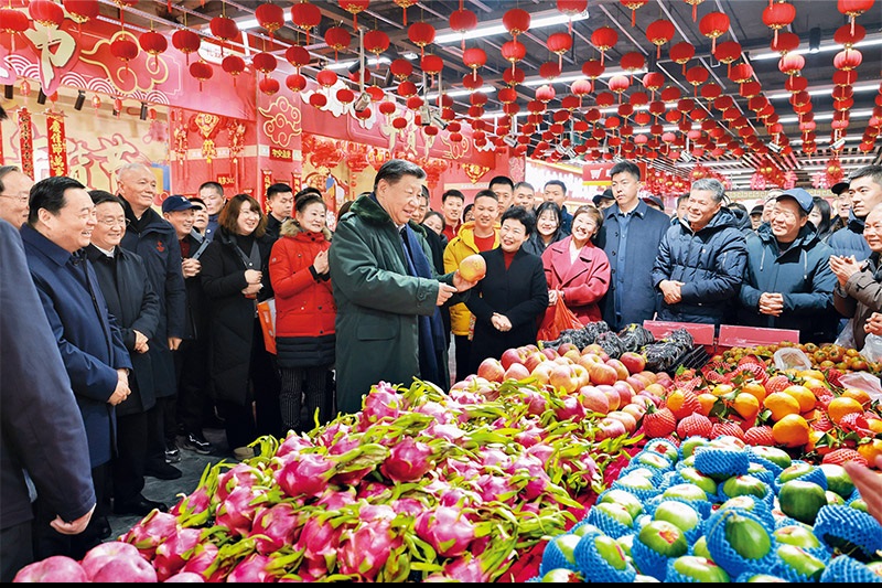 2025年1月22日至24日,中共中央总书记、国家主席、中央军委主席习近平冒着严寒来到辽宁,看望慰问基层干部群众。这是23日上午,习近平在沈阳大东副食品商场考察时,同店主和顾客亲切交流。新华社记者王晔/摄