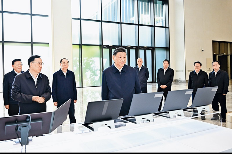 2025年11月7日至8日,中共中央总书记、国家主席、中央军委主席习近平在广东考察。这是8日上午,习近平在广州察看广东科技创新和产业创新融合发展成果展示。新华社记者燕雁/摄