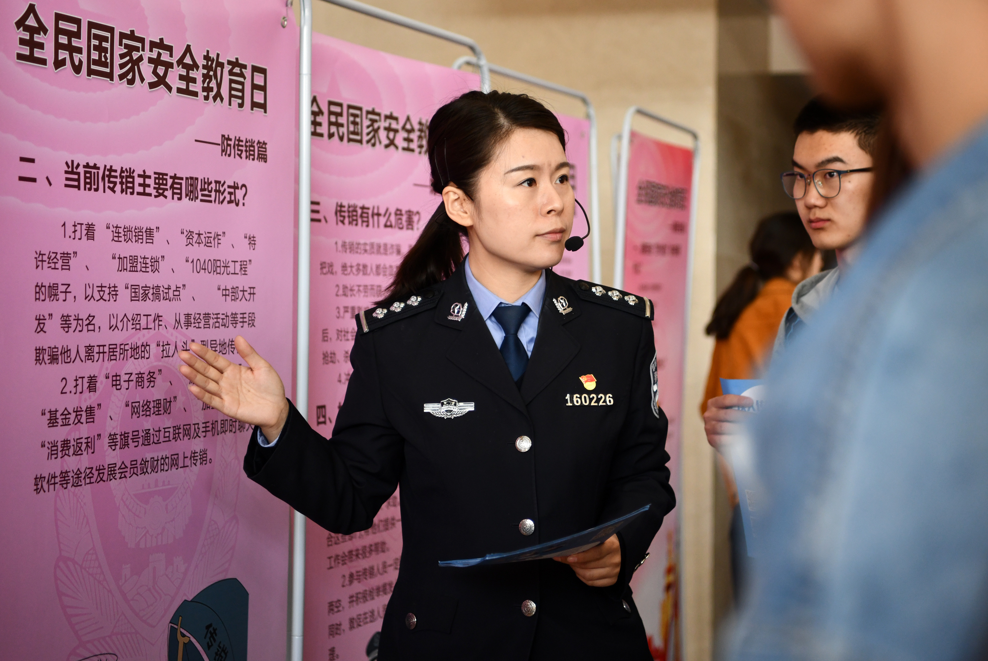4月15日,天津市教育系统2019年全民国家安全教育日宣传活动启动仪式在天津师范大学举行。这是民警给学生介绍反传销知识。