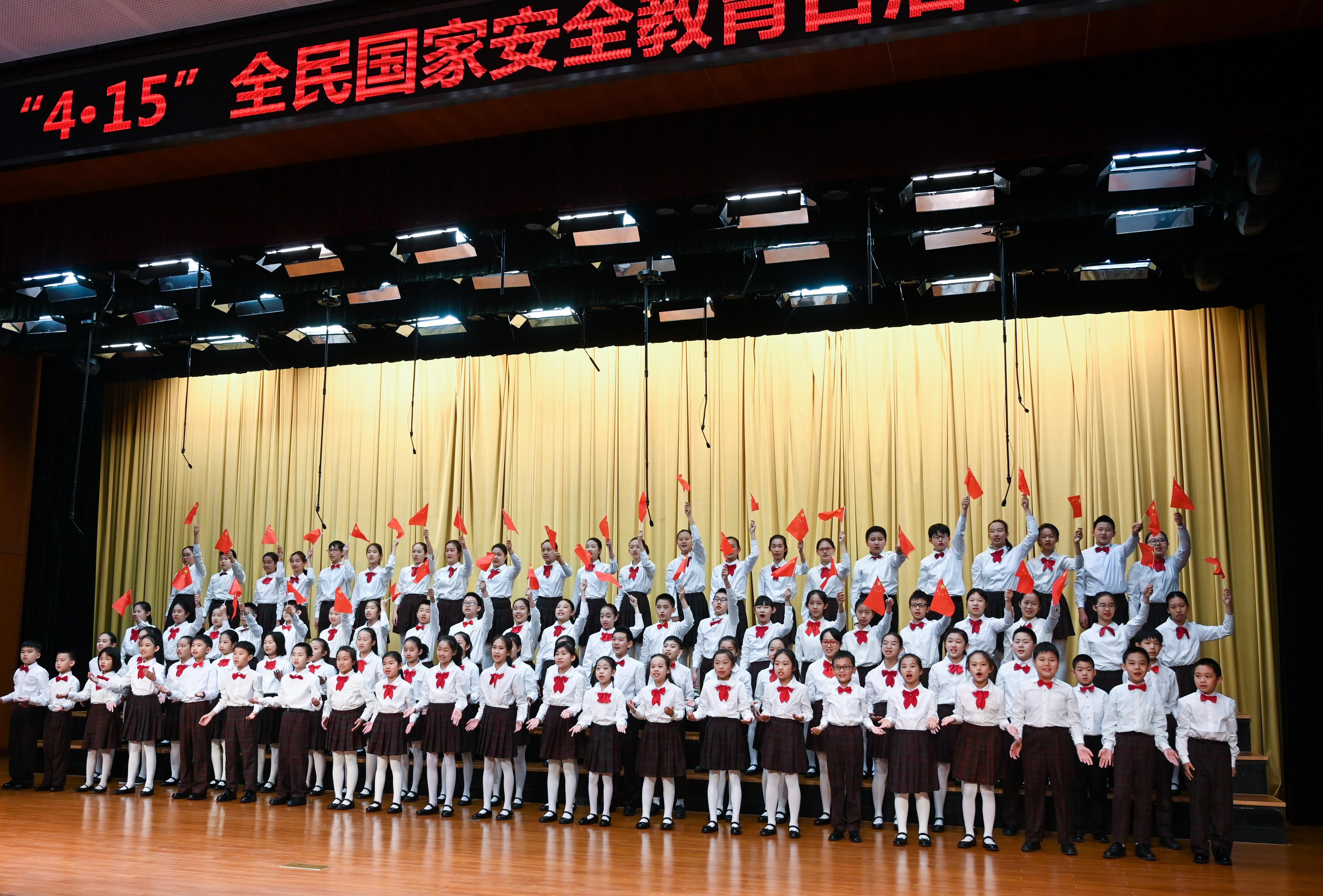 4月15日,北京第二实验小学金帆合唱团的同学们在学校举行的全民国家安全教育日活动上演唱歌曲《我爱你中国》。