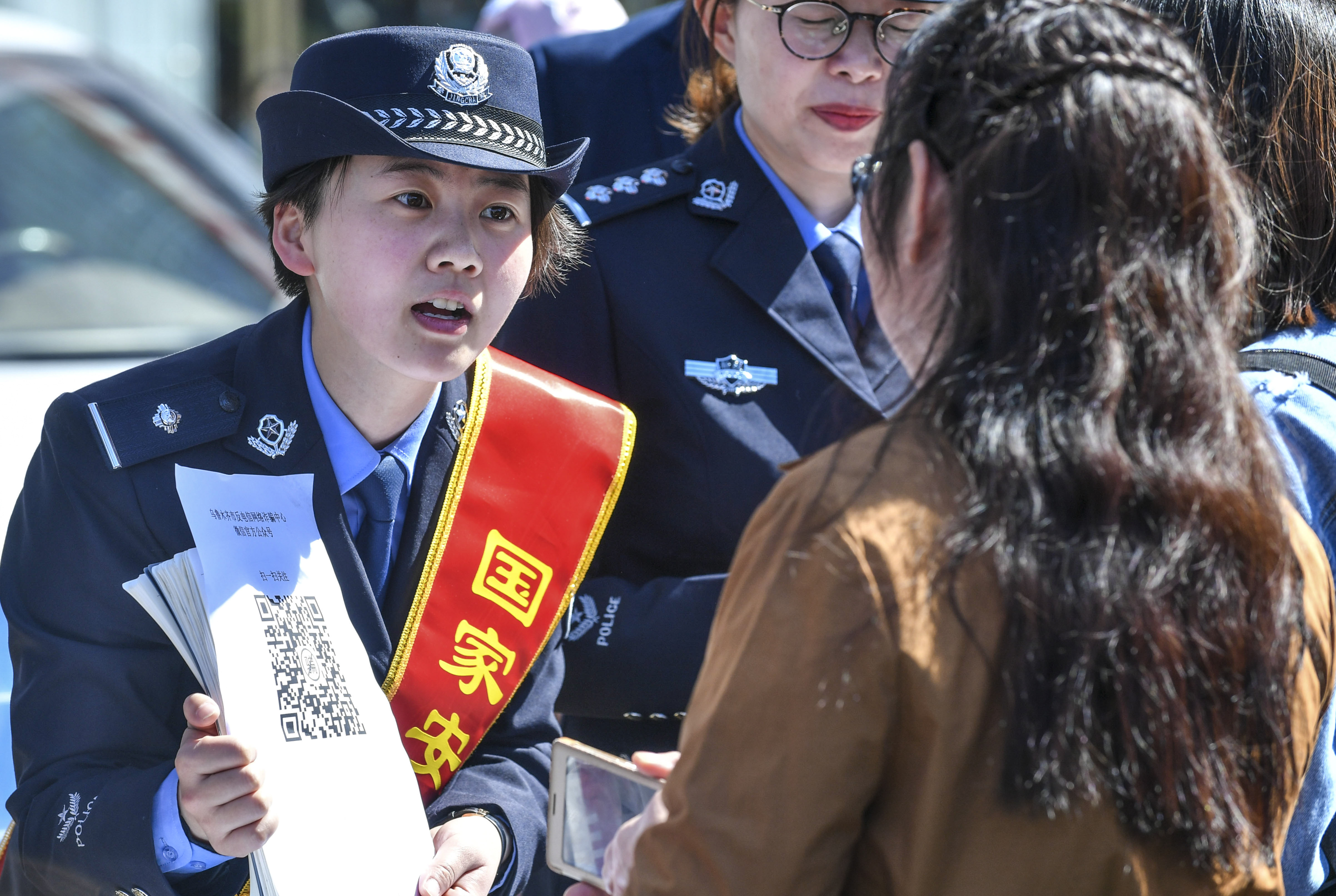 4月15日,在乌鲁木齐时代广场,乌鲁木齐市反电信网络诈骗中心工作人员朱文臻(左)在为前来咨询的市民讲解防诈骗技巧。