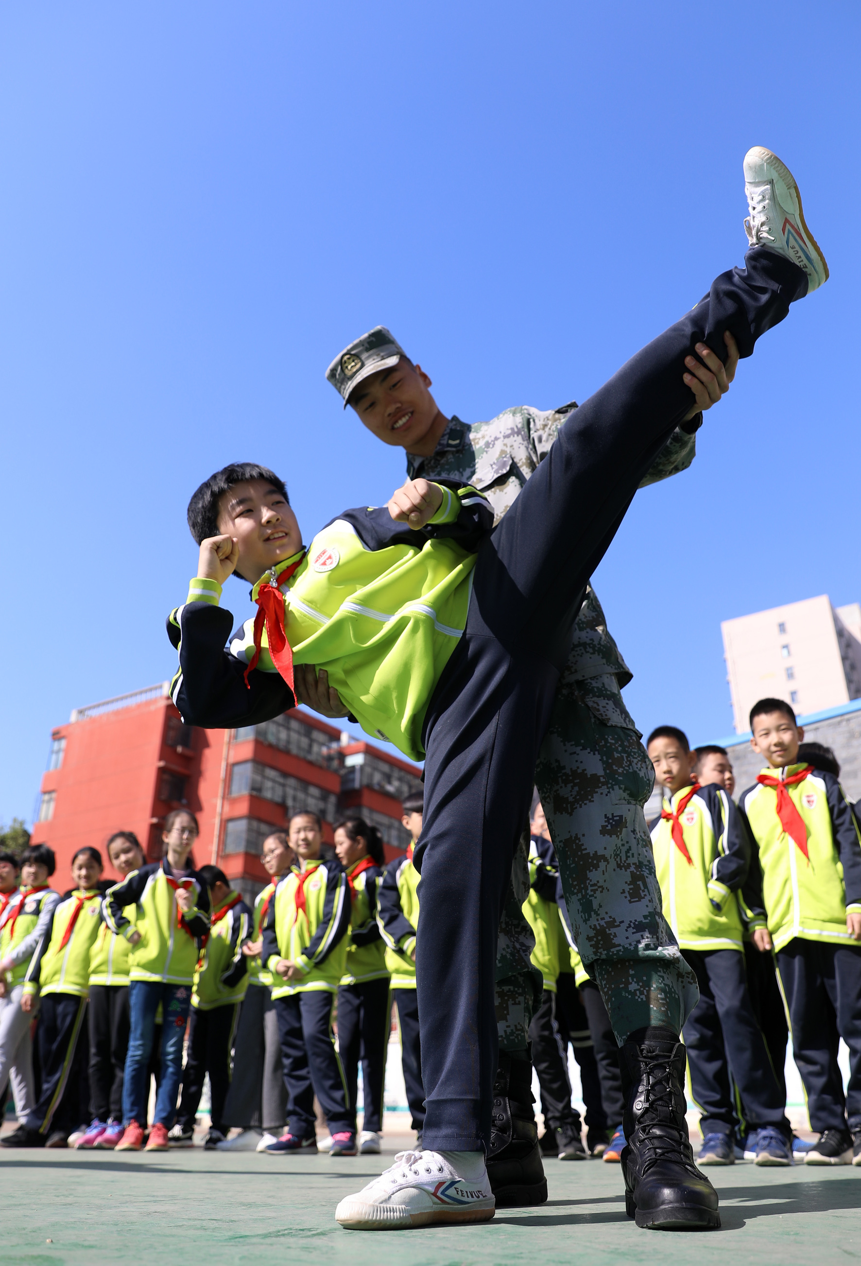 4月15日,在石家庄市桥西区中山西路小学,驻地某部队官兵在教授学生防身术。