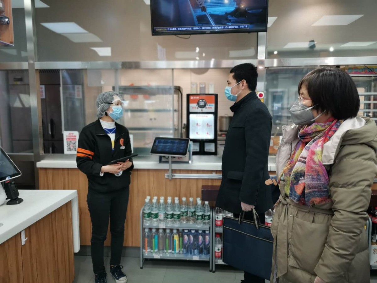 驻市国资委纪检监察组一行,“四不两直”到海龙大厦承租商户“便利蜂”便利店,实地检查调研疫情防控、经营复工等情况。图为为检查人员与店长问询具体情况。
