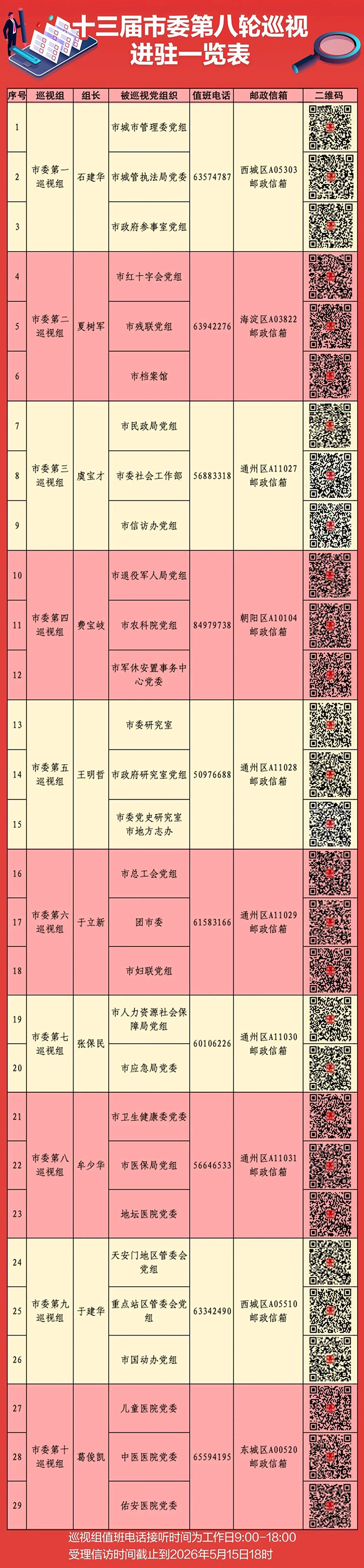 据了解,10个市委巡视组将在被巡视单位工作2个月左右,其间设立专门值班电话、邮政信箱和信访二维码,主要受理被巡视党组织领导班子及其成员、市委管理的其他干部及下一级党组织领导班子主要负责人、重要岗位领导干部问题的来信来电来访,重点是违反政治纪律、组织纪律、廉洁纪律、群众纪律、工作纪律和生活纪律等方面的举报和反映。其他不属于巡视受理范围的信访问题将按照规定转有关部门处理。巡视组受理信访时间截止到2026年5月15日。(熊珂)