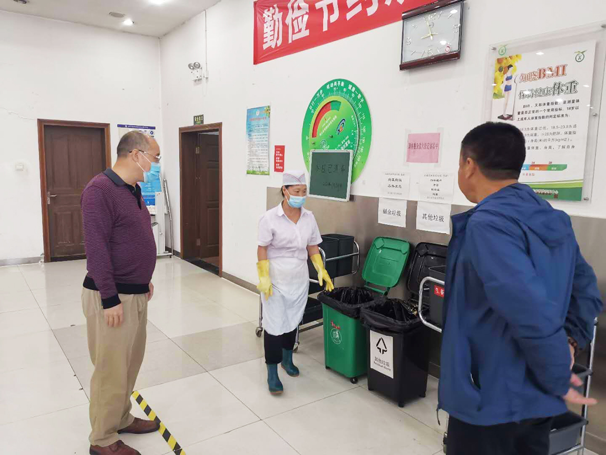 区纪委监委驻区国资委纪检监察组到区国资委机关食堂检查厨余垃圾倾倒情况,监督提醒杜绝浪费行为。郑丹 摄