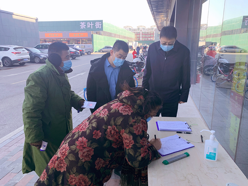 通州区潞邑街道纪工委监察组全国两会期间对东潞苑菜市场扫码登记、体温测量等疫情防控措施落实情况开展监督检查。魏琳 摄
