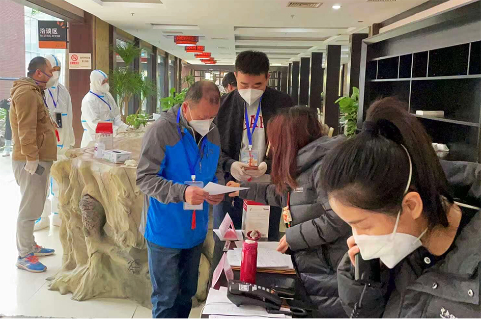 昌平区纪委监委牵头成立的北七家镇宏福苑社区封控区域联合现场检查组,在封控区内开展闭环监督检查。李伟聪 摄