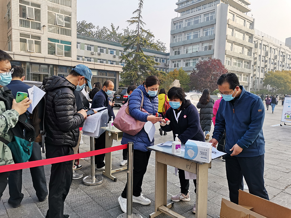 北京联合大学纪委监察专员办公室现场监督检查学校承担中小学教师资格考试考生入校防疫情况。姚志敏 摄