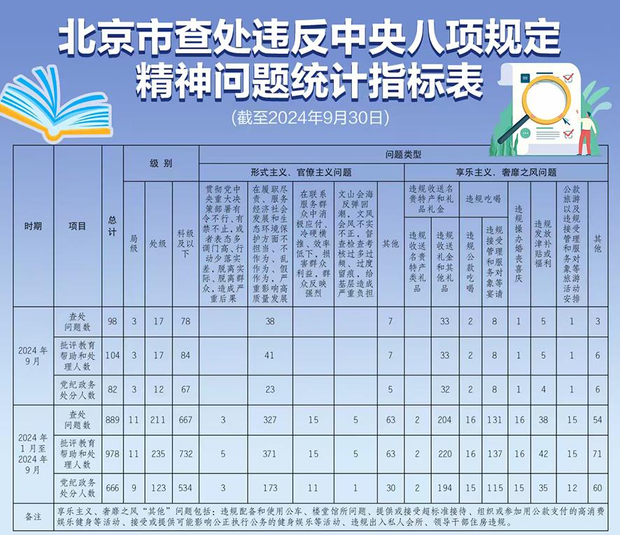 今年9月,本市查处违反中央八项规定精神问题98起,批评教育帮助和处理104人,其中局级3人、处级17人、科级及以下84人;给予党纪政务处分82人,其中局级3人、处级12人、科级及以下67人。查处问题主要集中在“在履职尽责、服务经济社会发展和生态环境保护方面不担当、不作为、乱作为、假作为,严重影响高质量发展”“违规收送礼金和其他礼品”“违规接受管理和服务对象等宴请”等方面。
