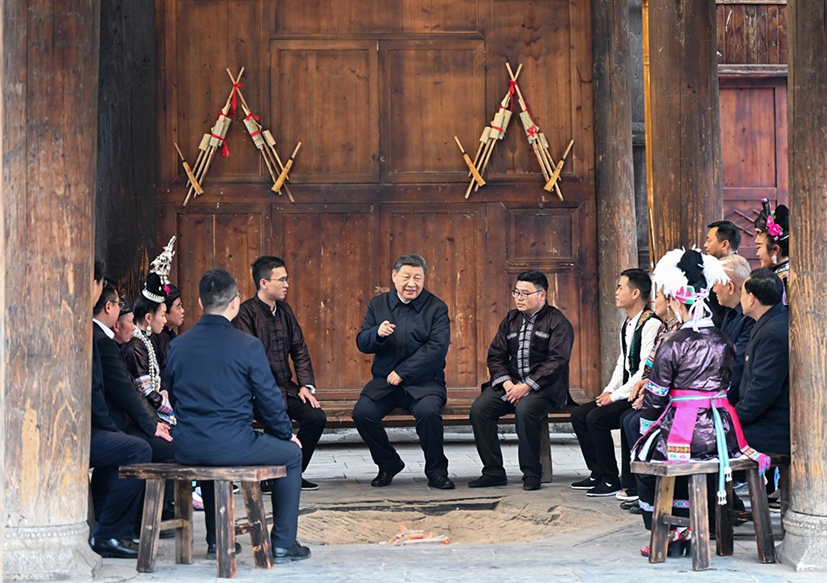 3月17日至18日,中共中央总书记、国家主席、中央军委主席习近平在贵州考察。这是17日下午,习近平在黔东南州黎平县肇兴侗寨考察时,同村民们亲切交流。新华社记者 翟健岚 摄