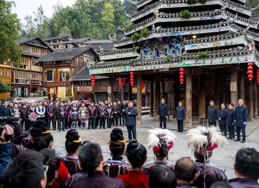 3月17日至18日,中共中央总书记、国家主席、中央军委主席习近平在贵州考察。这是17日下午,习近平在黔东南州黎平县肇兴侗寨考察时,身着民族盛装的村民在寨门口唱起侗族大歌欢迎总书记。新华社记者 谢环驰 摄