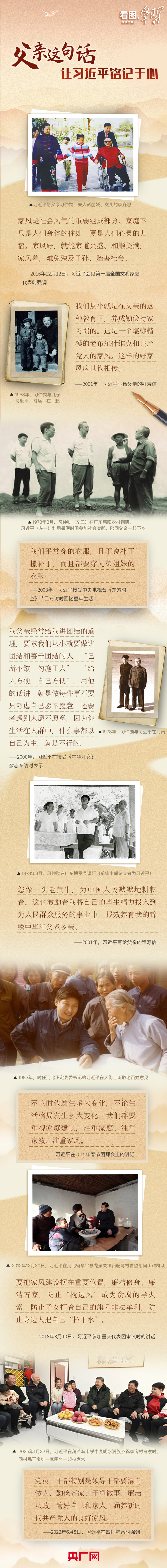 父亲习仲勋对习近平有着很深的影响。在写给父亲的拜寿信中,习近平提到很多“从父亲这里继承和吸取的宝贵与高尚品质”,包括为人坦诚忠厚、做事不居功不张扬、对信仰的执著追求、赤子情怀、生活俭朴等。这份深沉的父爱是习近平心中应世代相传的家风。
